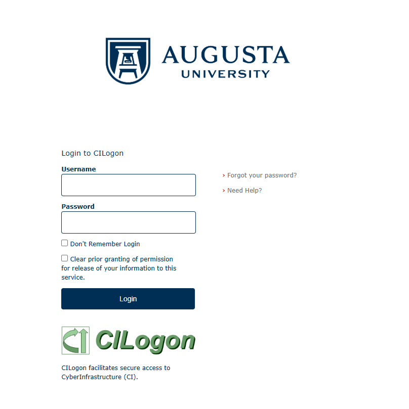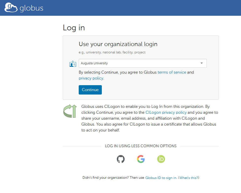 Begin by logging into your Globus account. Select Augusta University as your organizational login and sign in using your Augusta University username and password.
