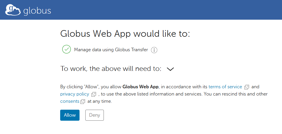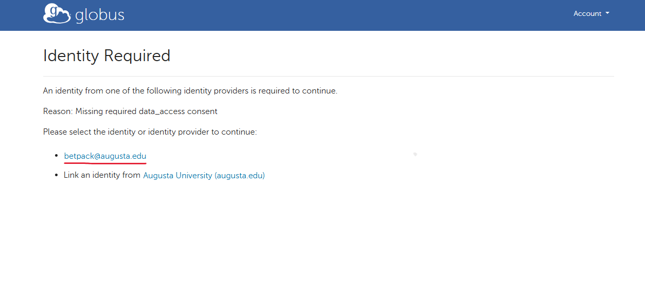 When prompted, choose your augusta.edu email as your identity and then select Allow to grant Globus permission to manage data transfers.