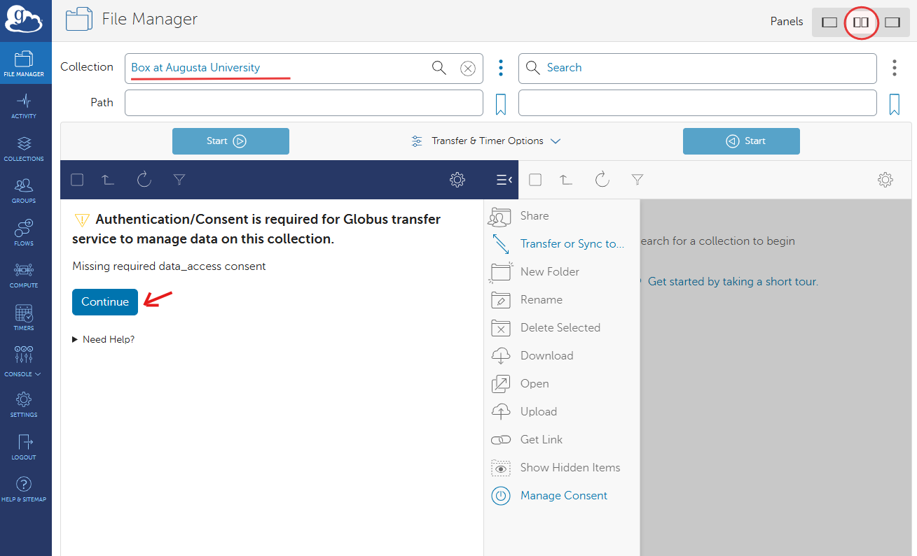 Once you are logged in, navigate to the File Manager tab on the sidebar and search for Box at Augusta University. Globus will request permission to manage your data, so click Continue to proceed.