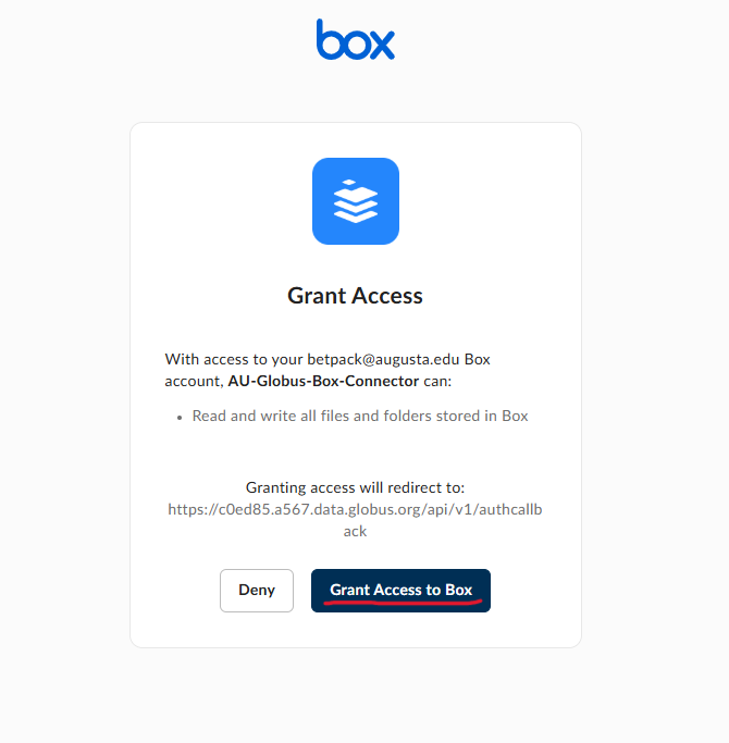 Globus will also require permission to access your Box account. Click Continue, then select Grant Access when the Box request window appears. Enter your Augusta University email to provision credentials and click Continue.