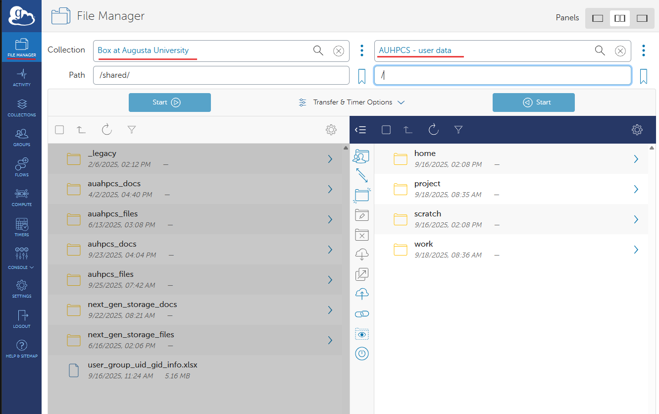 To view both your Box data and your AUHPCS data simultaneously, switch to the two-panel layout by selecting the middle option in the panel settings at the top right of the screen. In the new panel, search for AUHPCS – user data to open your cluster storage collection.
